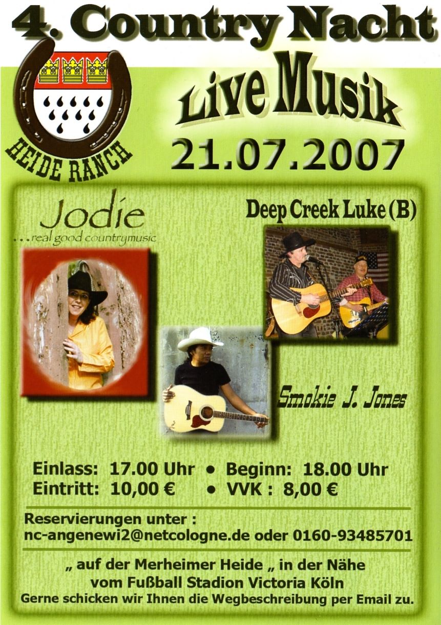4. Country Night auf der Heide Ranch in Köln (Merheimer Heid - Nähe Fußballstadion Victoria Köln) u.a. mit Jodie, Deep Creek Luks und Smokie J. Jones [der Flyer] |
